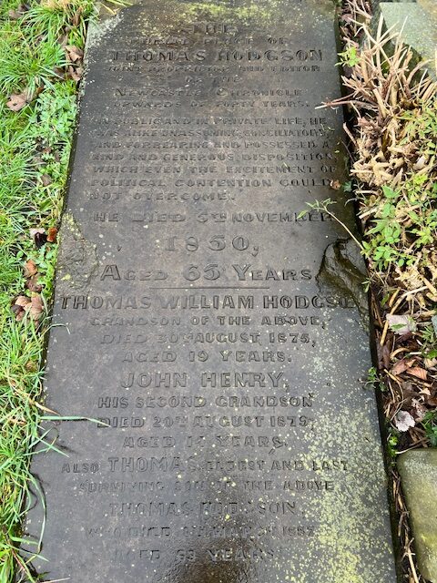 Thomas died on the 5th November 1850, aged 65, with his death being reported in the Newcastle Guardian on 9th November thus, ‘At his house, in Albion-street, on the 5th inst, aged 65, after a very protracted illness, Mr Thomas Hodgson, late one of the proprietors, and for upwards of forty Years, editor of the Newcastle Chronicle. In that paper of yesterday there is a graceful notice of the deceased, from which we extract the following:-“His editorial labours were marked throughout by the kindliest feelings; the asperity of party was to him a thing unknown, and amidst all the excitement of political strife, and even occasionally of personal contention, he ever maintained a high tone of gentlemanly feeling, never overstepping the bounds of fair and honourable discussion, or failing to treat either the opinions or feelings of others with courtesy and forbearance.