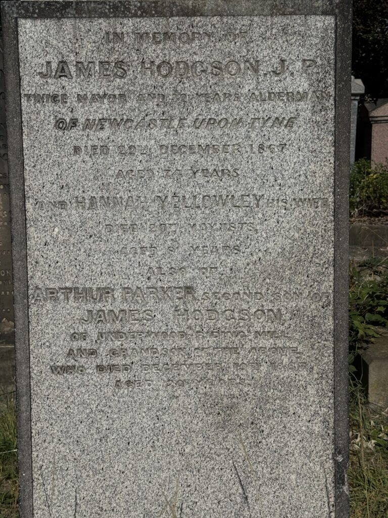 A report of his funeral in the local press follows: ‘Funeral of Mr. Alderman Hodgson. The funeral of this lamented gentleman took place yesterday afternoon, in Jesmond Cemetery; and was attended by a very large number of friends of the deceased. The funeral was of a public character; and several public bodies took part in it. The members of the Newcastle Corporation, of which the deceased had been a distinguished member, assembled at the town hall at 12 o’clock; From then proceeded to the residence of the deceased, in Eldon Street. Here a procession was formed in the following order: – Six police officers; the mace and sword bearers of the Corporation; the Freeman and stewards of the incorporated companies, with the chairman, Mr. W. Meikel: policemen; members of the town, council and corporation; officials of the North-Eastern Railway, of which Mr Alderman Hodgson was a director; the hearse; five mourning coaches; the Mayor’s carriage; private carriages; and body of police. The first mourning coach contained Mr. James Hodgson, son of this deceased; Mr. J Hodgson, nephew; Mr. Park, Mr. T. Hodgson, and Mr. James Scarth, relatives. In the second coach there were four of the six pall-bearers, Mr R.P. Philipson, town clerk of Newcastle; Mr John Clayton, ex town clerk; Alderman I.L .Bell, and Alderman T. Wilson. In the third coach, the remaining pall-bearers, Alderman J. Sillick, Alderman A. Nichol, and Alderman Dodds, and the Vicar of Newcastle. The fourth coach contain Mr. Alderman Hunter, ex Mayor; Mr. T. Bourne and Dr. Rayne. In the fifth coach there were Mr. G.A. Brumell, borough treasurer, Mr. Havelock, Mr. Henry Tennant, and Mr. Eyton. Among the private carriages there were those of Alderman Bell, Alderman Dodds, Alderman Hedley, Alderman Nichol, Alderman Laycock, Gosforth; Alderman Blackwell, Mr. B. C. Lawton, Benwell; Mr. Henry Tennant, Gateshead; Mr. W.J. Hutchinson, Mr. A Grey, Jesmond; Mr. R. Fail, Mr. R.W. Hodgson, the Vicar of Newcastle, Dr. Humble, and Dr. Rayne. The solemn service of the Church was read by the Rev. the Vicar of Newcastle. The coffin which was double cased and handsomely ornamented, was placed in a brick vault overshadowed by a willow and holly trees, not far from the lower gate of the cemetery. It bore the following inscriptions; – James Hodgson Died 22nd December, 1867 Age 74.